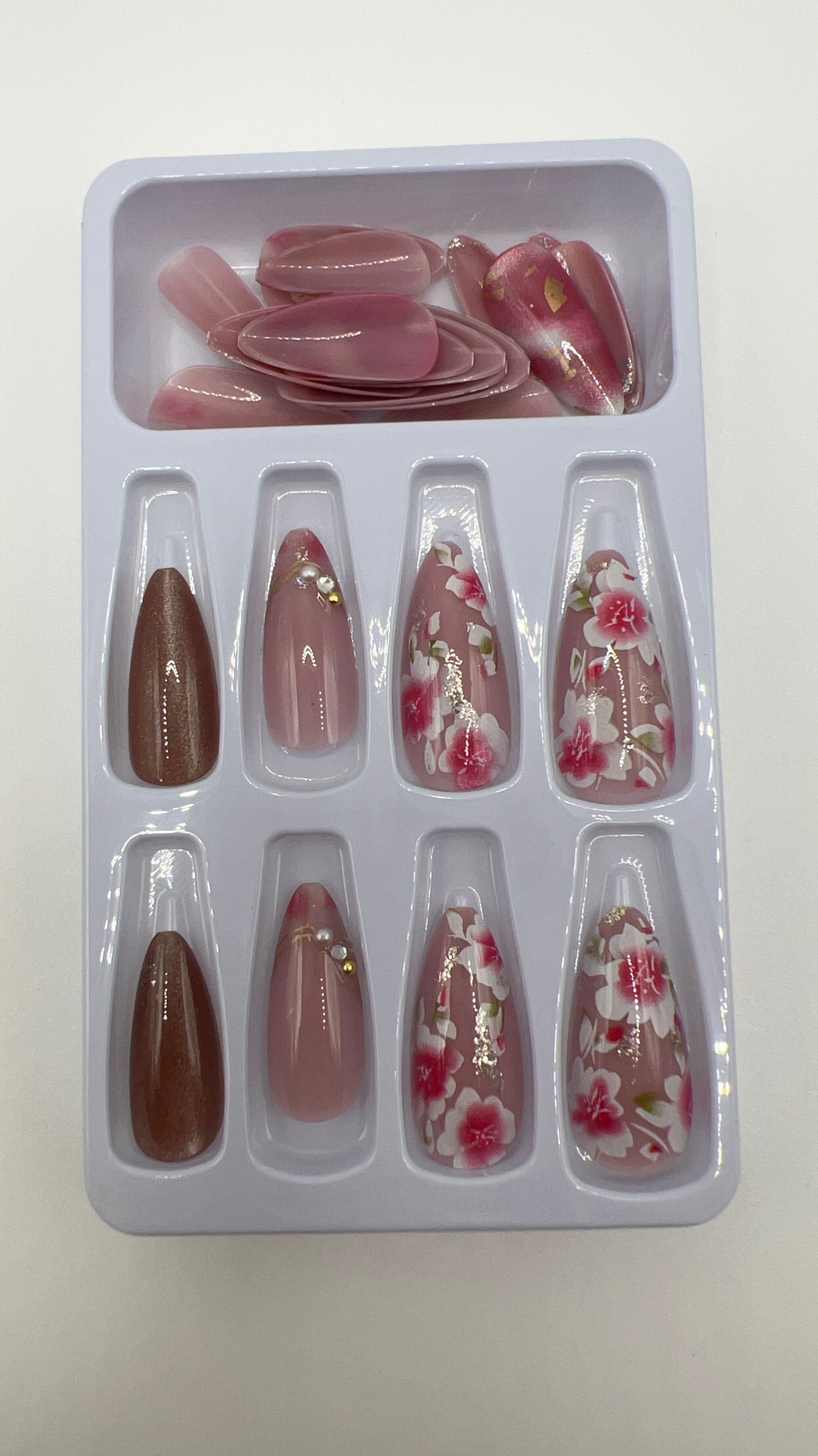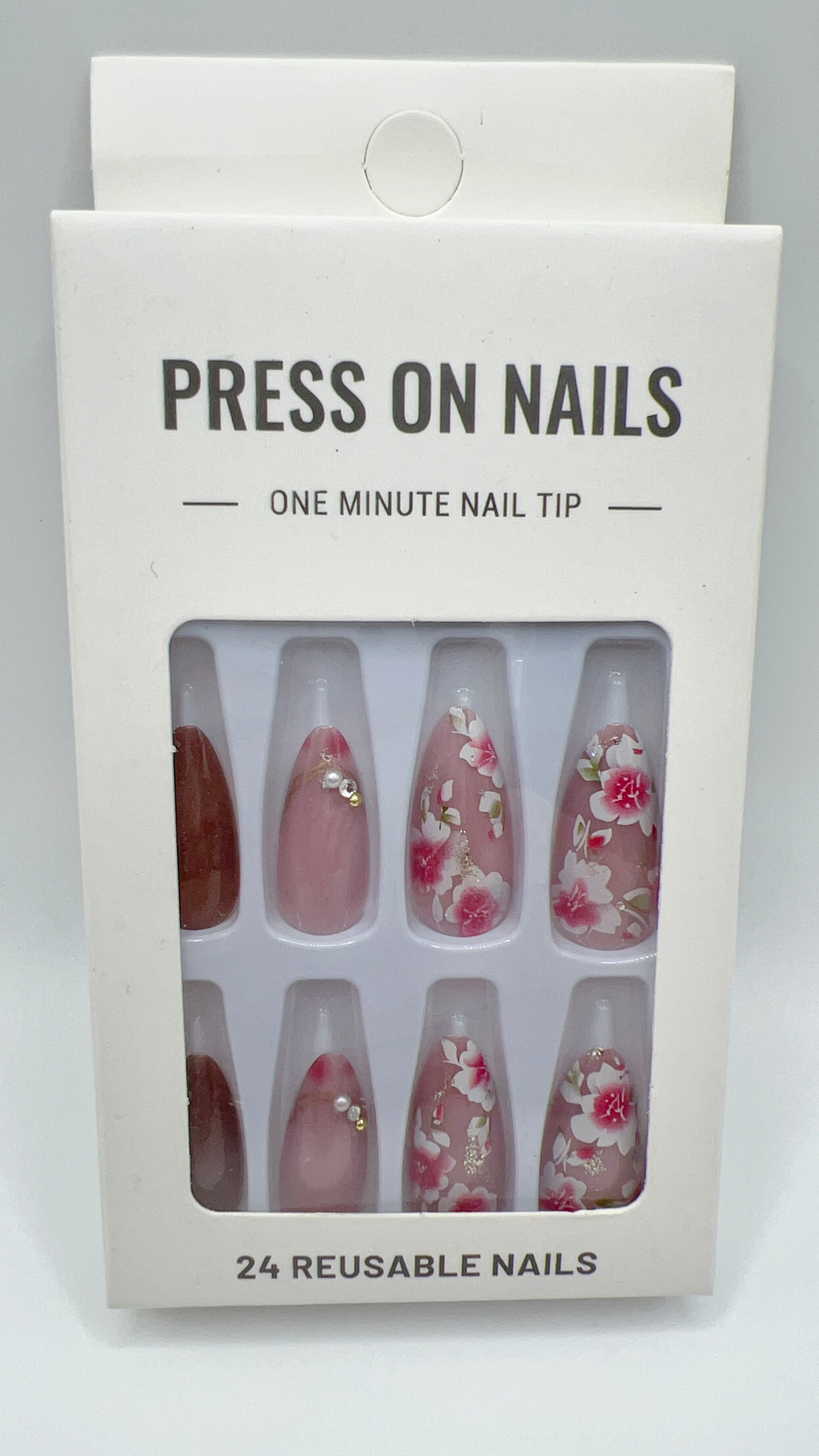 24 pcs Almond Press-On Nails β Flower, Pink, Fashionable Style