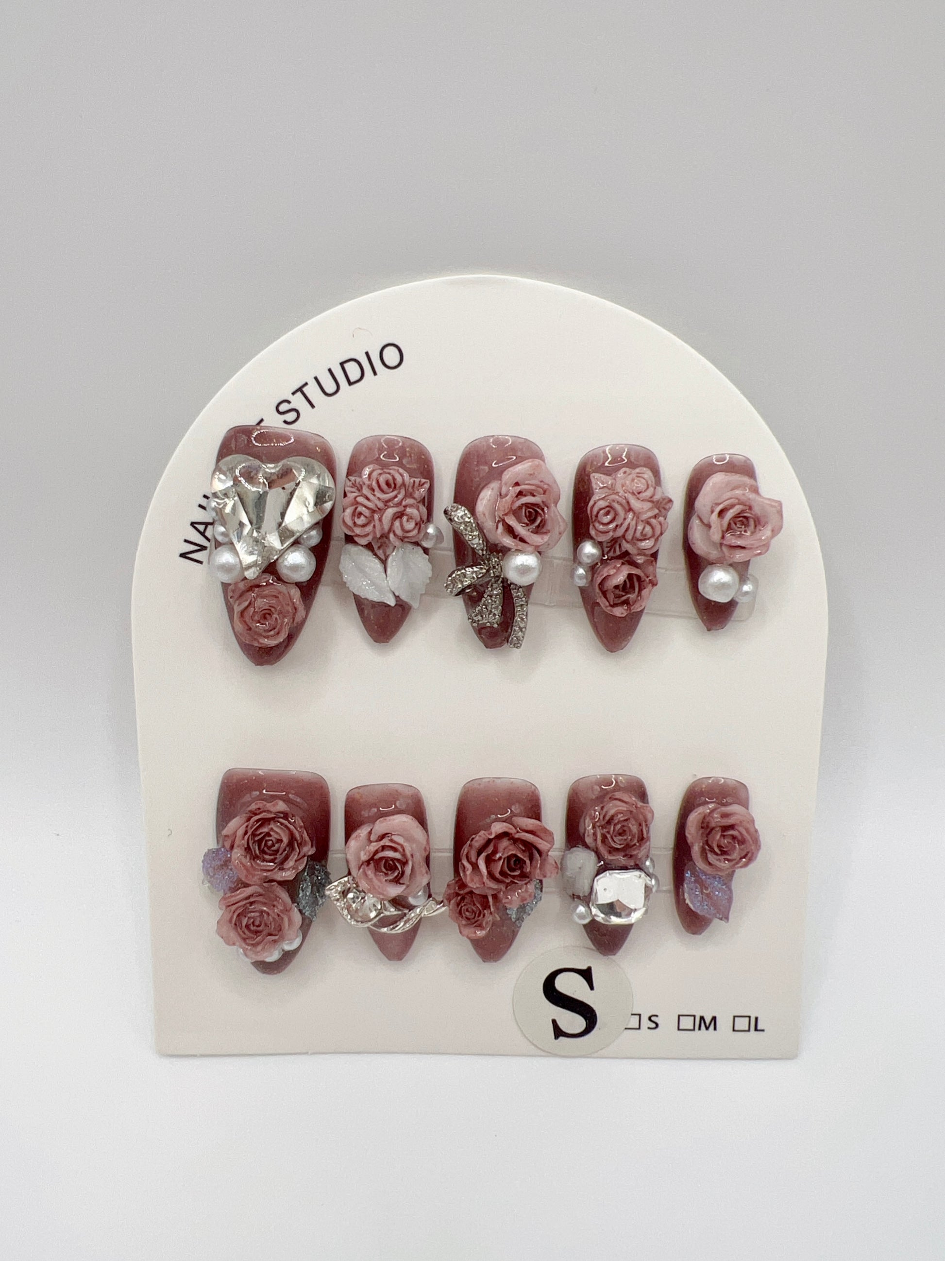 Brown Almond Press On Nails with Rhinestone 2D Flowers Small Size