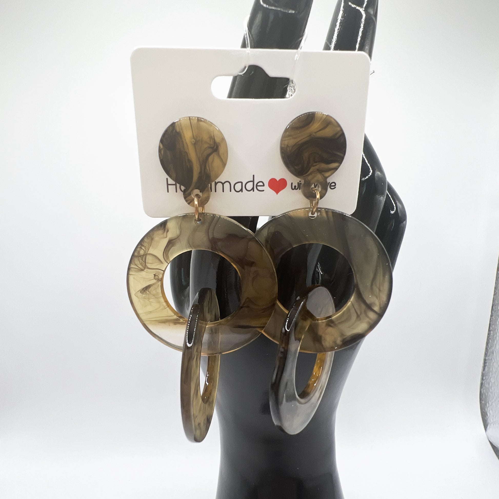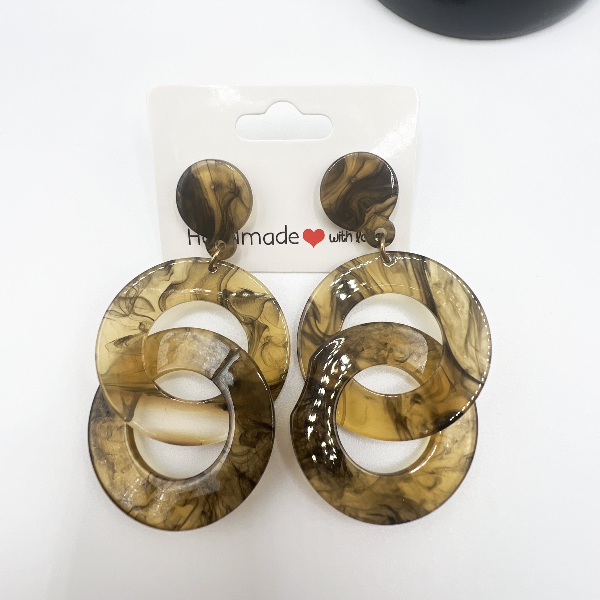🤎 Light Brown & Black Tie-Dye Linked Acetate Drop Earrings — Elegant yet bold, these earrings feature interlinked acetate hoops in a sophisticated #TieDye pattern of warm neutrals and deep black.
