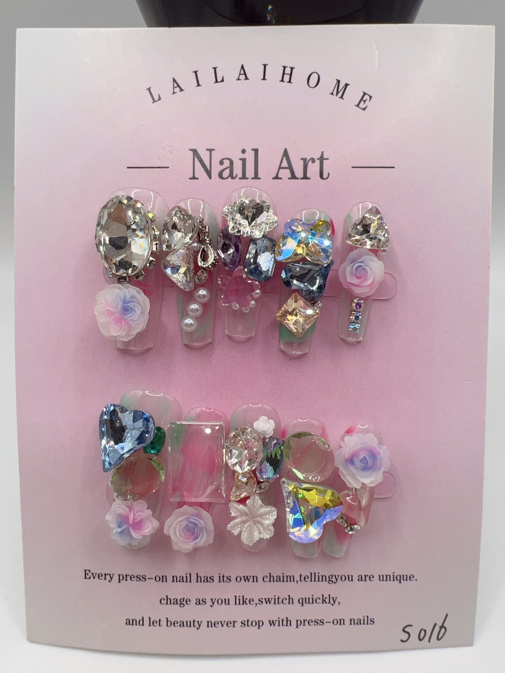 Long Coffin Press-On Nails with Heavy Rhinestones & 2D Flower Charms ā 10 Designs, Small Size