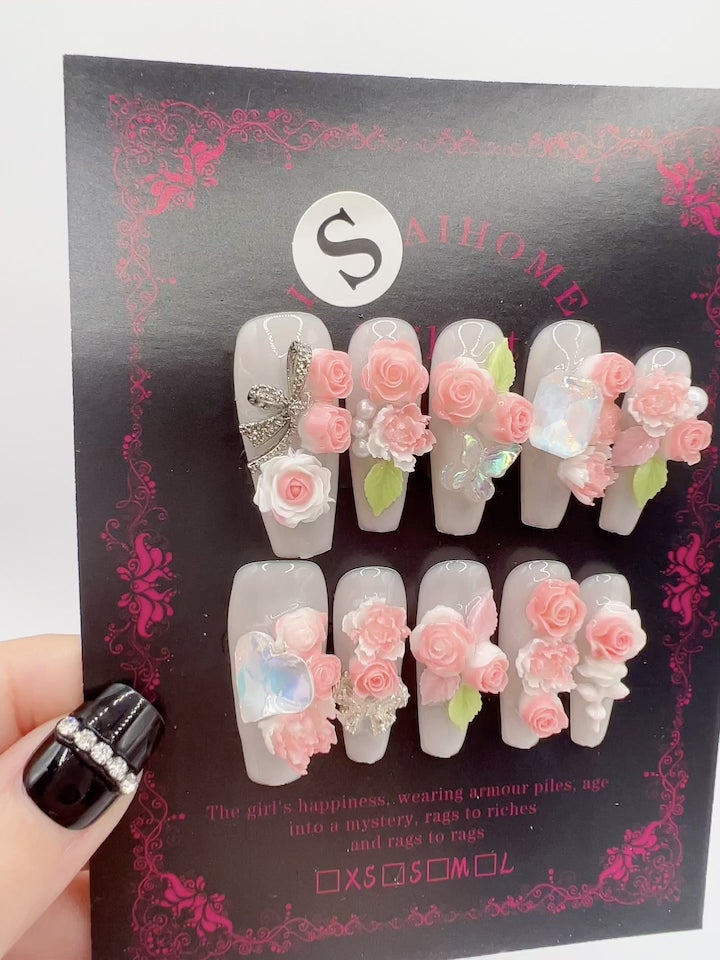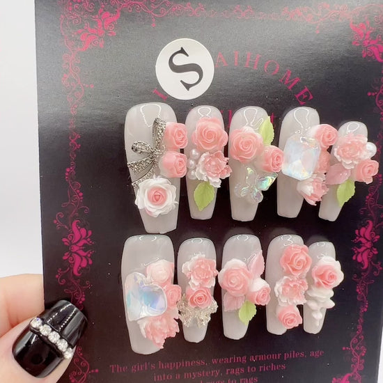 Adorned with luxury 3D flower charms, this set adds a sophisticated and artistic touch to your manicure. Designed in a small size for a perfect fit, these nails offer a comfortable, salon-quality look thatโs ideal for parties, dates, or everyday wear.
