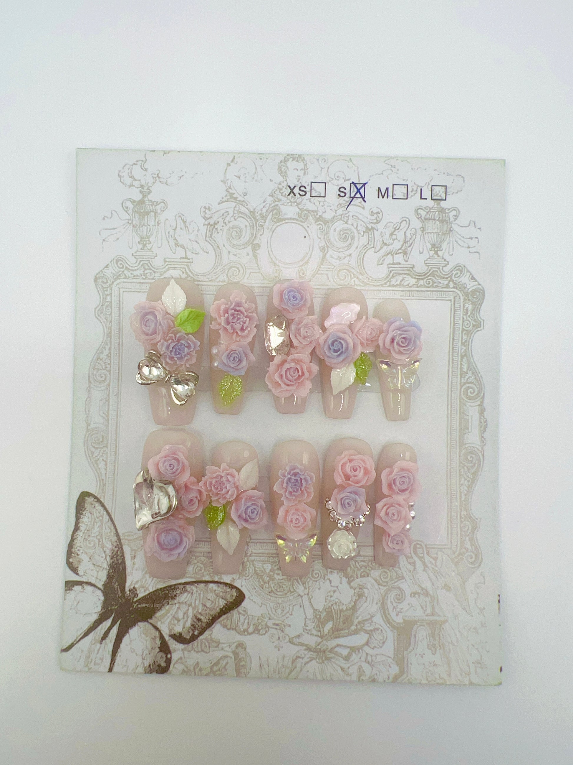 Long Coffin Press On Nails with Rhinestone and 2D Flowers β Small Size