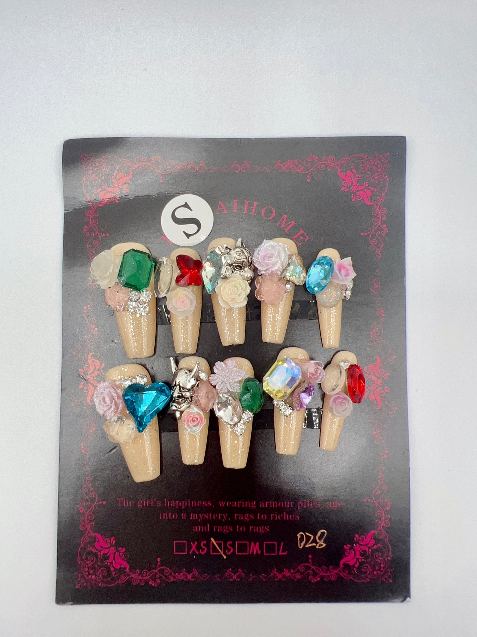 Long Coffin Press On Nails with Rhinestone and 2D Flowers β Small Size
