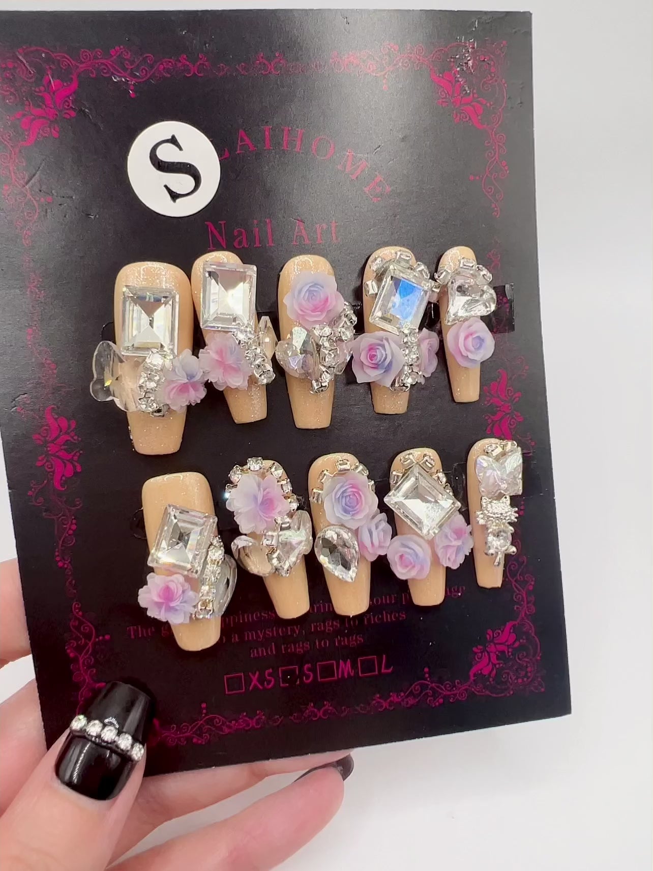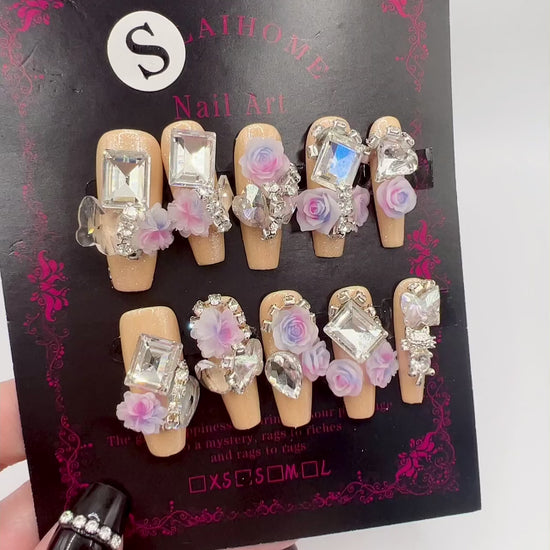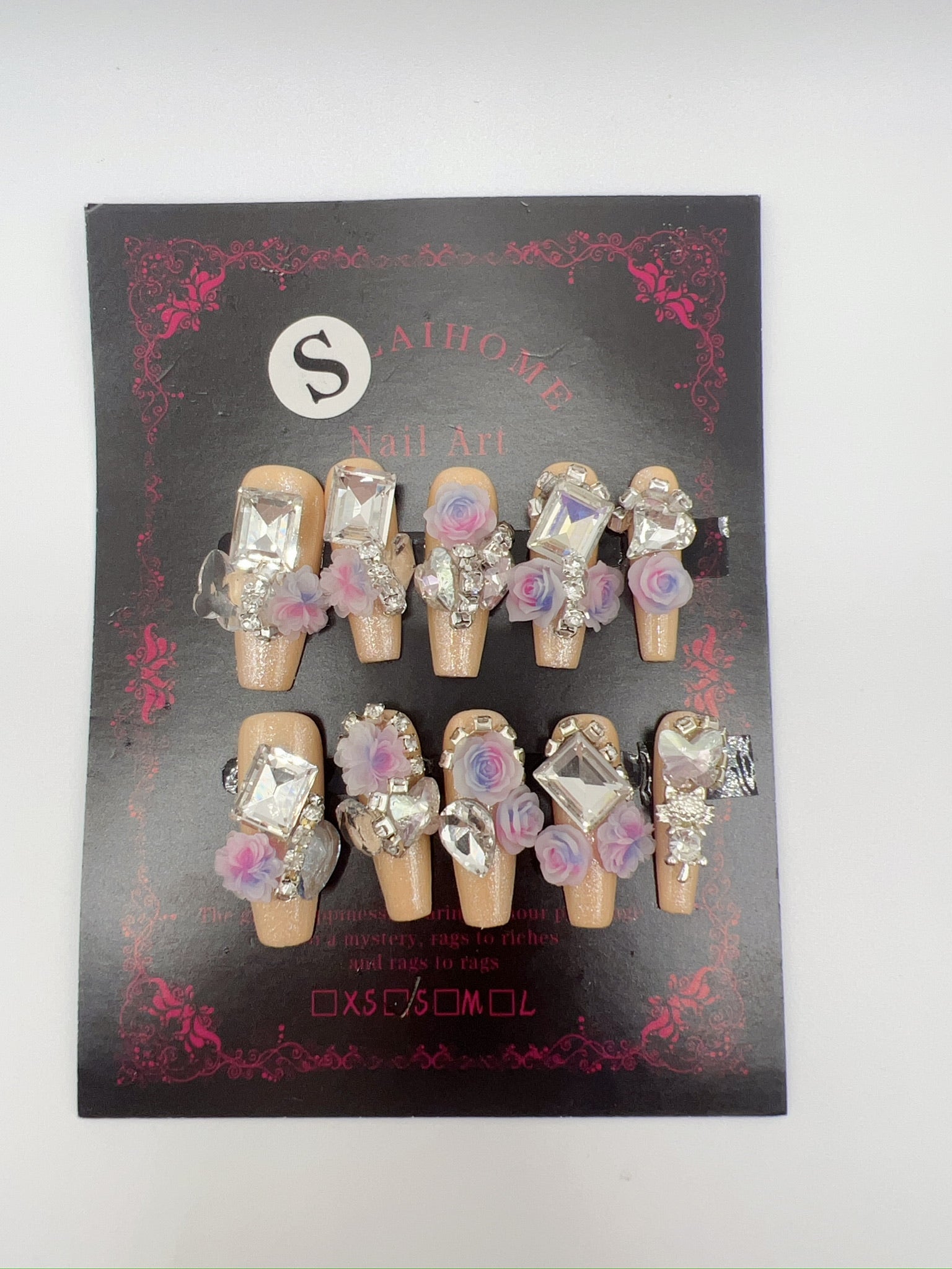 Long Coffin Press On Nails with Rhinestone and 2D Flowers β Small Size