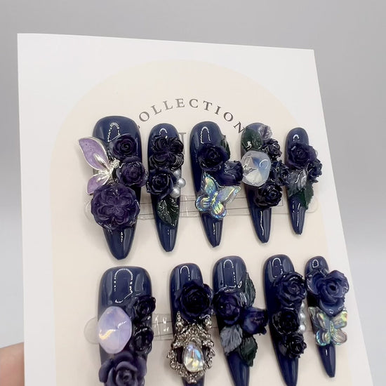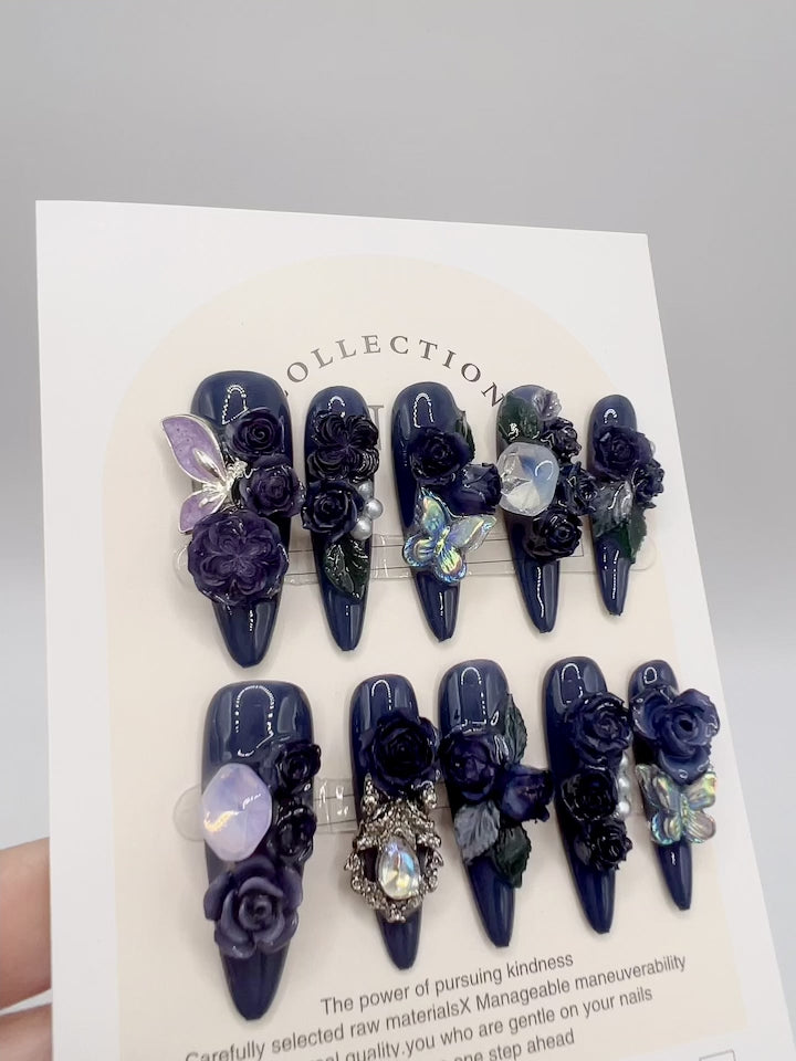 Long Stiletto Press On Nails with Rhinestone & 2D Flowers – Small Size