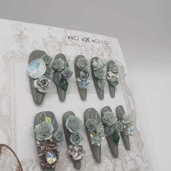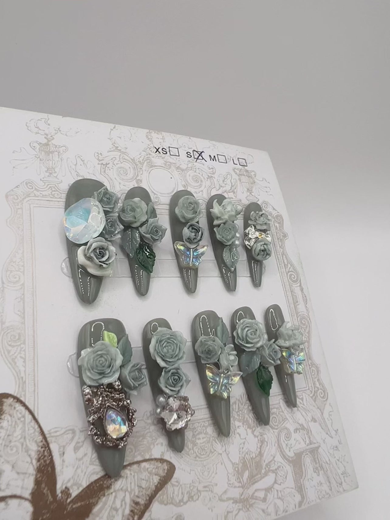 Long Stiletto Press On Nails with Rhinestone & 2D Flowers – Small Size