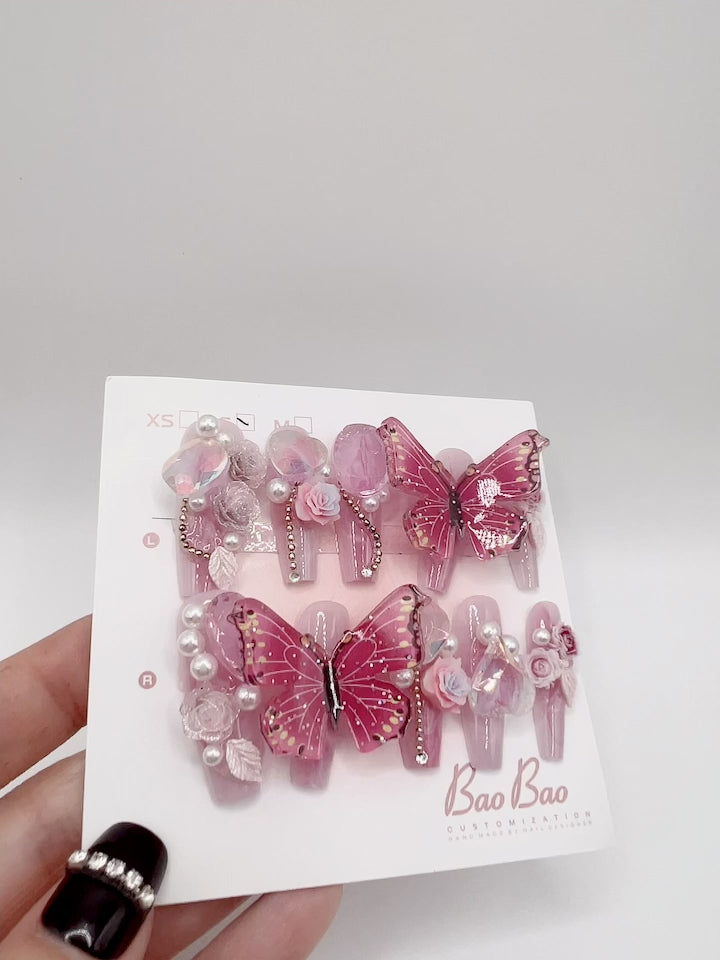 Luxury Long Coffin Pink Press-On Nails with 2D Flower & Butterfly Charms