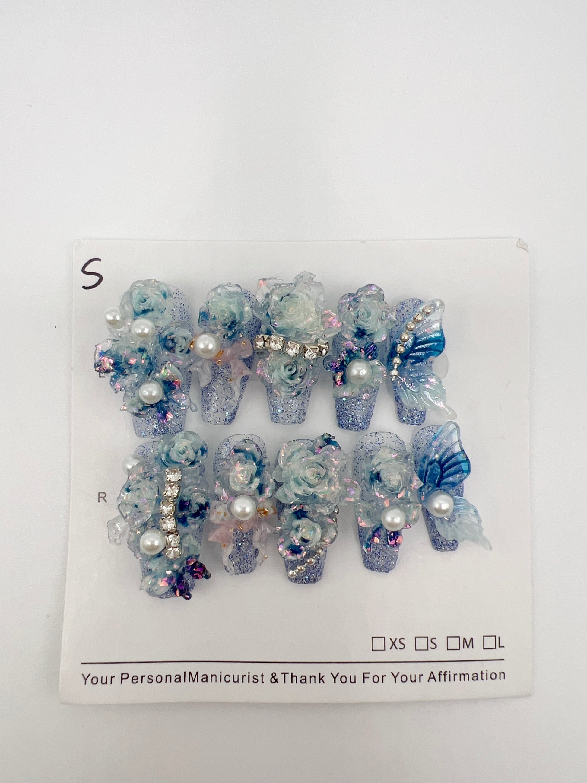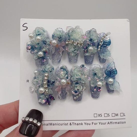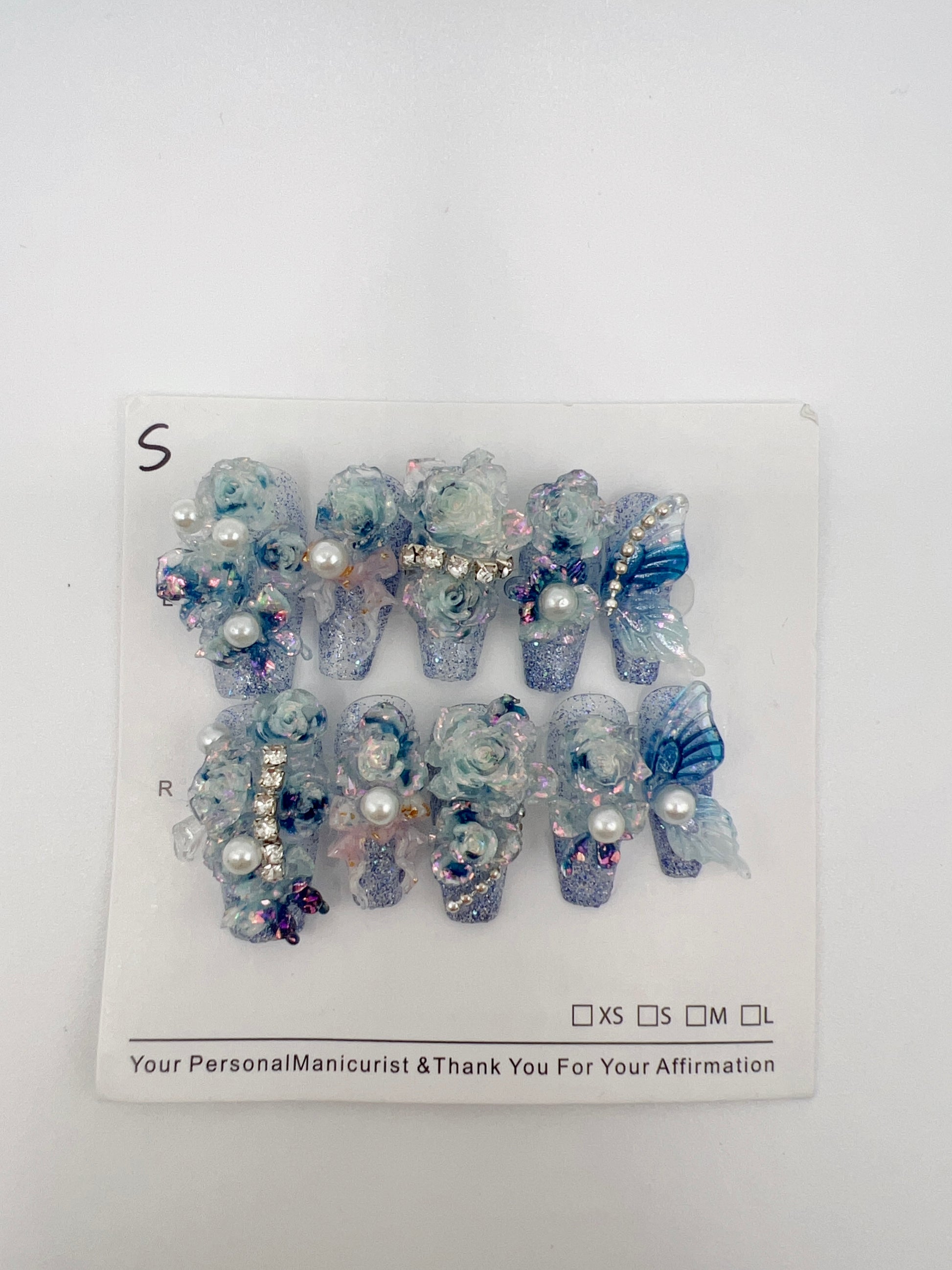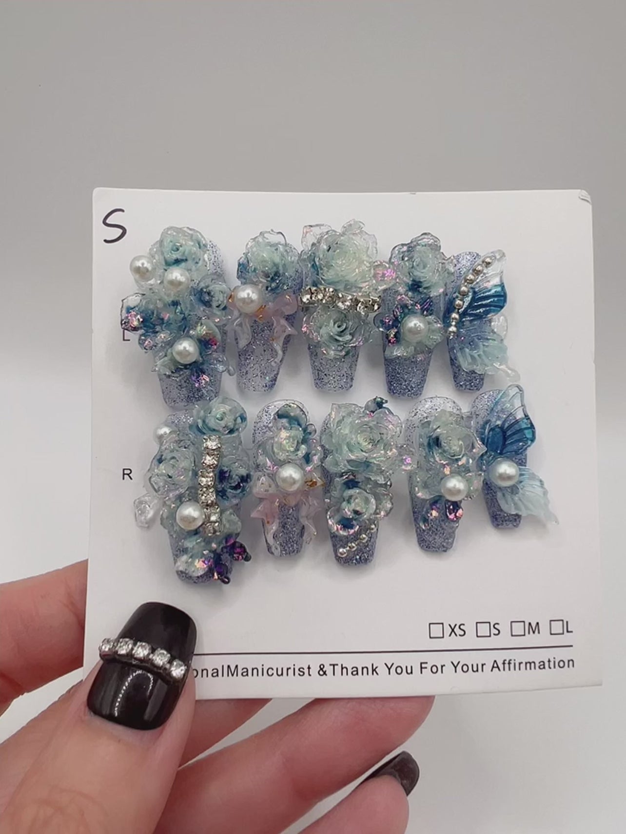 Luxury Medium Coffin Press-On Nails with 2D Flower & Pearl Charms