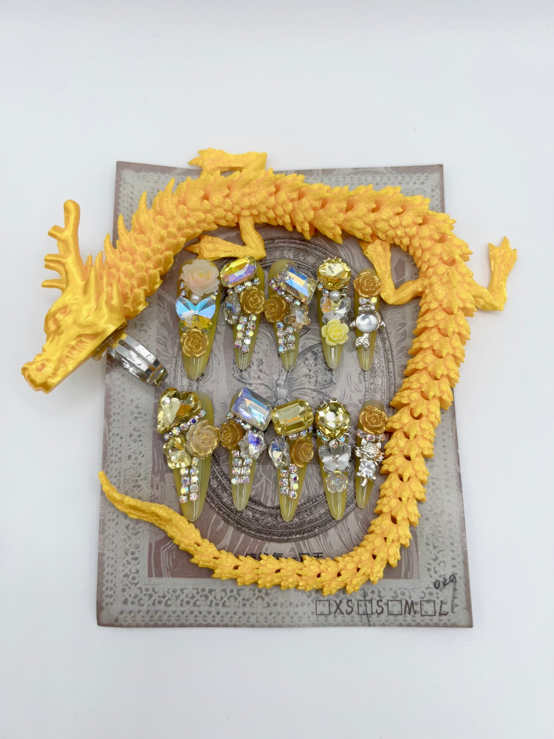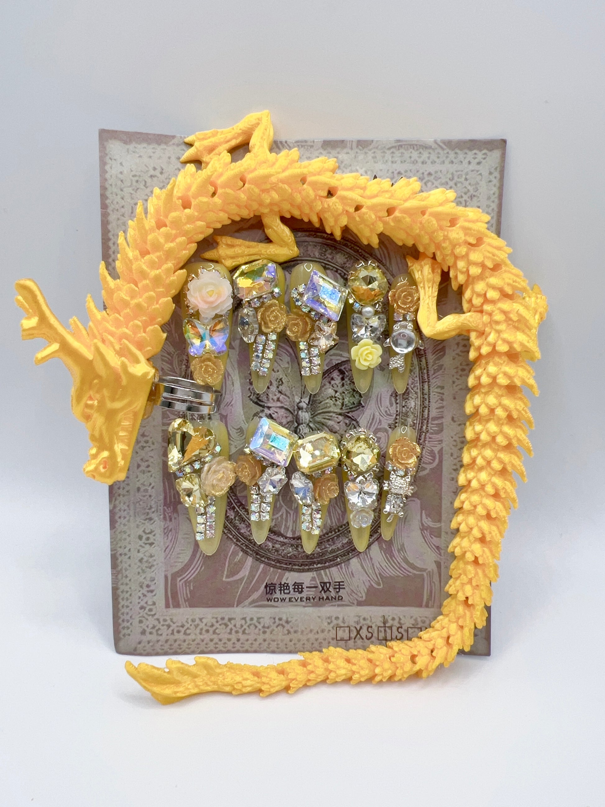 Designed in a long stiletto shape, this set delivers dramatic elegance with a high-end salon finish—no appointment needed. The mix of sparkling crystals, floral details, and dragon rings creates a statement look perfect for special occasions or standout everyday glam.