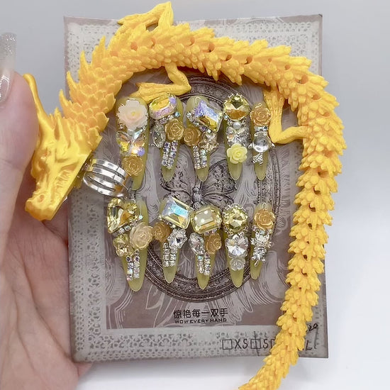 Turn heads with these luxury rhinestone press-on nails, featuring elegant 3D flower charms paired with bold dragon ring accents for a striking blend of romance and edge.