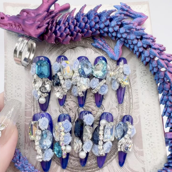Turn heads with these luxury rhinestone press-on nails, featuring elegant 3D flower charms paired with bold dragon ring accents for a striking blend of romance and edge.