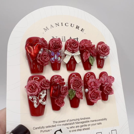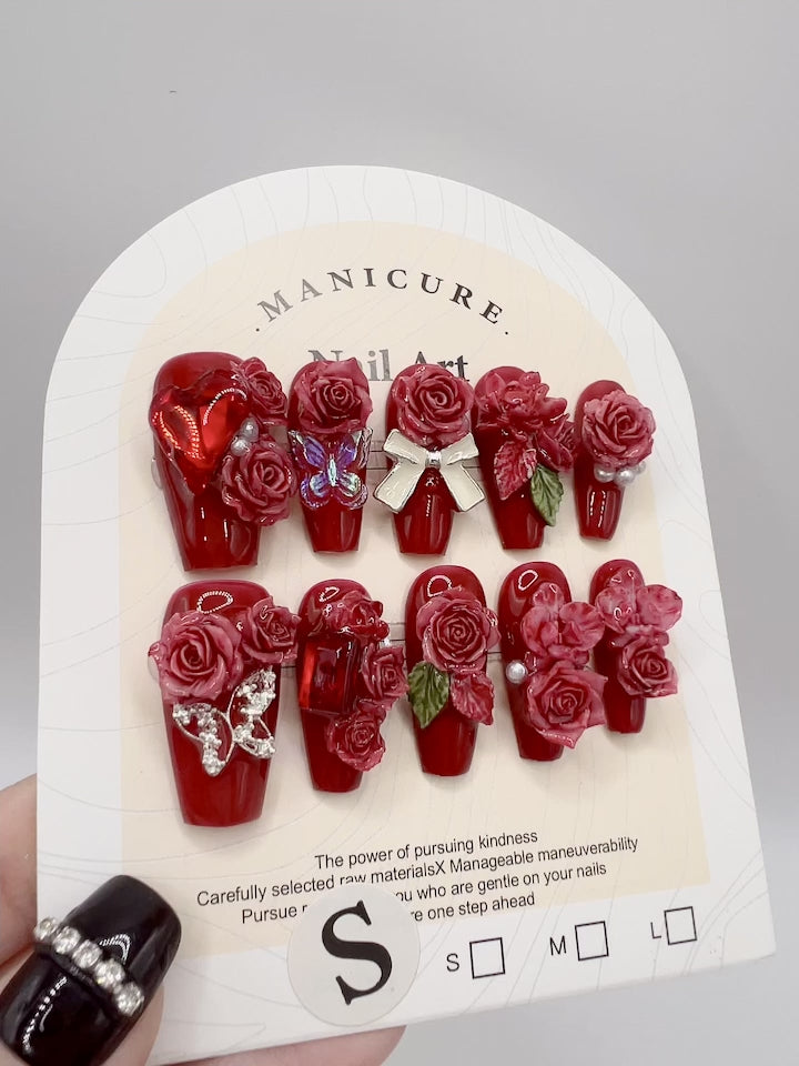 Medium Coffin Press On Nails with Rhinestone & 2D Flowers β Small Size