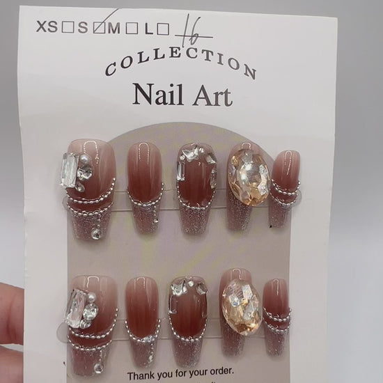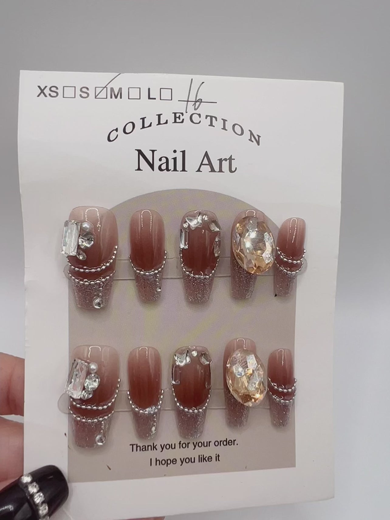 Shine with timeless elegance ✨ — these Medium Coffin Press-On Nails feature a glitter French tip design adorned with sparkling rhinestones.