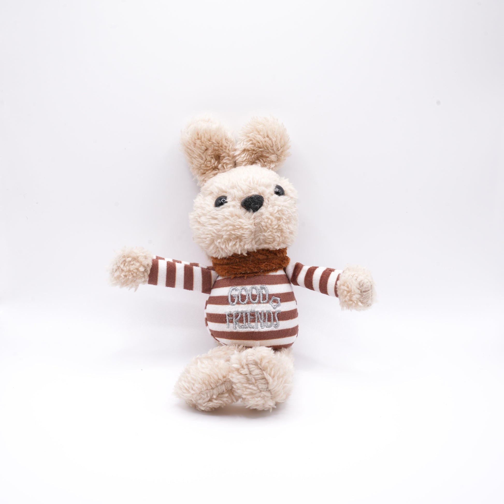 This pendant/keychain features an adorable plush bunny with soft, cream-colored fur and a friendly expression. It is dressed in a brown and white striped sweater with the words "GOOD FRIENDS" embroidered on the front, adding a charming and heartfelt touch. With its cozy design and compact size, this keychain makes a perfect accessory for bags or keys, bringing warmth and cuteness wherever you go.