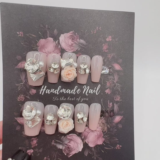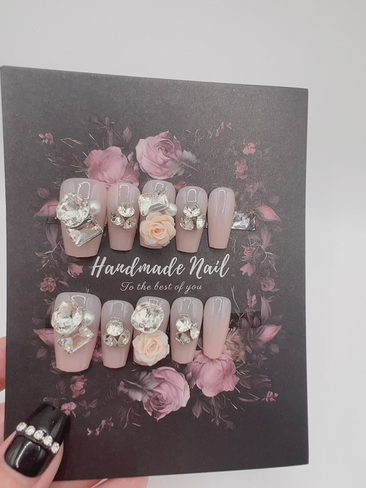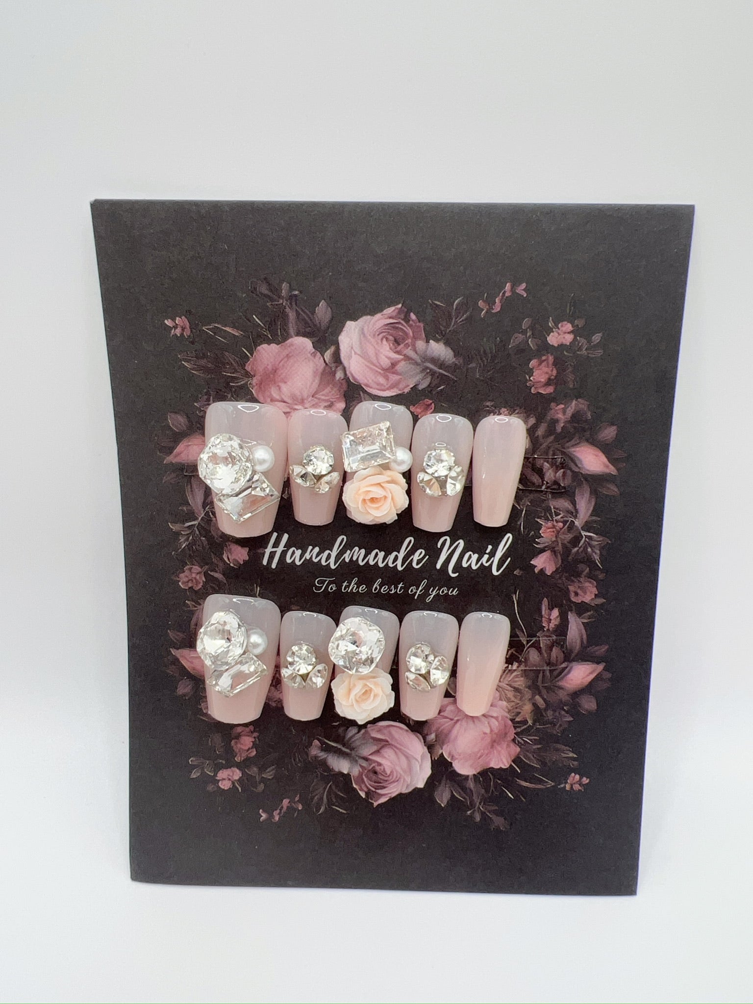 Short Coffin Press-On Nails with Rhinestones & 2D Flower β Medium Size