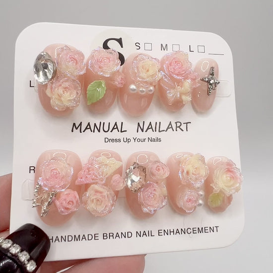 Embrace a soft and feminine look with these Short Oval Press On Nails featuring 2D flowers and delicate charms πΈπ.
